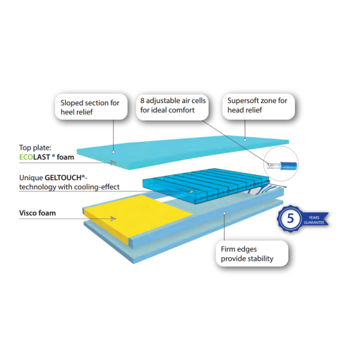 Antidekubitný matrac HF Air Hybrid nemeckej výroby. Má široké spektrum vlastností, vďaka ktorým je tento matrac ideálnou voľbou pre pacientov s rizikom vzniku dekubitov 4. štádia (vysoké riziko) a perfektným doplnkom rehabilitačných postelí.