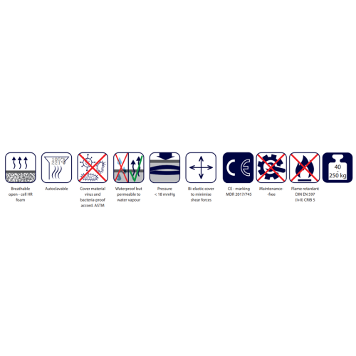 Hyperelastické penové jadro (s pozdĺžnymi a diagonálnymi priesečníkmi). Matrac je vysoký 18 cm, je vyrobený z troch vrstiev - každá vrstva má inú hustotu. Toto riešenie má pozitívny vplyv na zdravie chrbtice pacienta. Výnimočný ventilačný systém pre ideálnu mikroklímu (s pozdĺžnymi a diagonálnymi priesečníkmi) - veľmi dôležitá vlastnosť pri dekubitoch. Nosnosť 40 kg až 250 kg. Nepremokavý, ale priedušný inkontinenčný poťah zaisťuje výbornú mikroklímu. 5 ročná záruka.