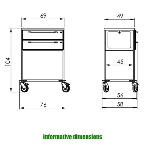 Kovový vozík z nehrdzavejúcej ocele AISI304. Konštrukcia je vybavená antivibračnou výstuhou. Vybavenie vozíka: 2 x plocha s 12 mm prelisom, nosnosť 50 kg, 1 x zásuvka veľkosti S (výška 60 mm), 1 x zásuvka veľkosti M (výška 120 mm), 1 x zásuvka veľkosti L (výška 200 mm), nosnosť 20 kg, 1 x obojstranne výsuvný kôš, nosnosť 15 kg. Zásuvky sú prachotesné v MS prevedení. Vnútorný priestor je možné deliť priečkami. Čelo zásuvky je z kompaktného ABS plastu, farba je voliteľná zo vzorkovníka. Vozík má centrálne uzamykanie. Kolesá sú otočné, s plastovými nárazníkmi, priemeru 125 mm, z toho 2 s brzdou. Nosnosť výrobku je 175 kg.