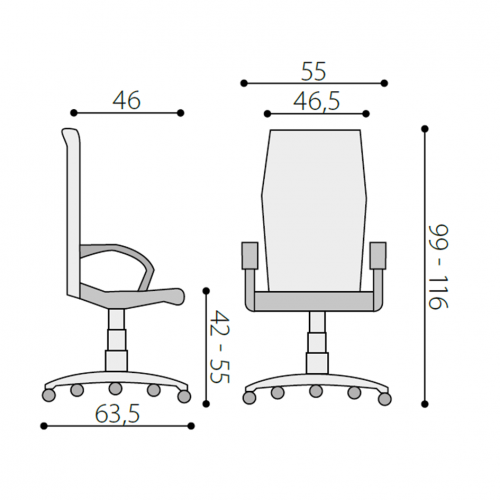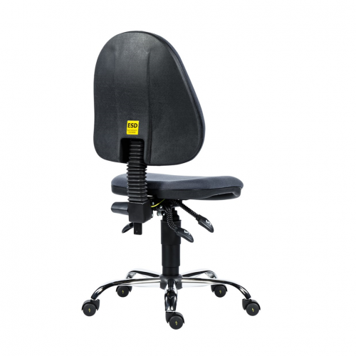 Pracovná stolička s asynchrónnym mechanizmom s nezávislým nastavením uhla sedáka a operadla, aretovateľné v ľubovoľnej polohe. Stolička je konštruovaná tak, aby odvádzala statickú elektrinu z pracoviska. Všetky súčasti stoličky sú vodivé, merný odpor 0,1 MΩ. Odtieň poťahu je antracit. Báza je chrómovaná s pogumovanými ESD kolieskami. Nosnosť je 130 kg.