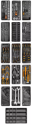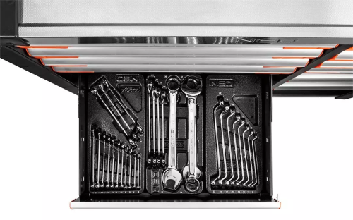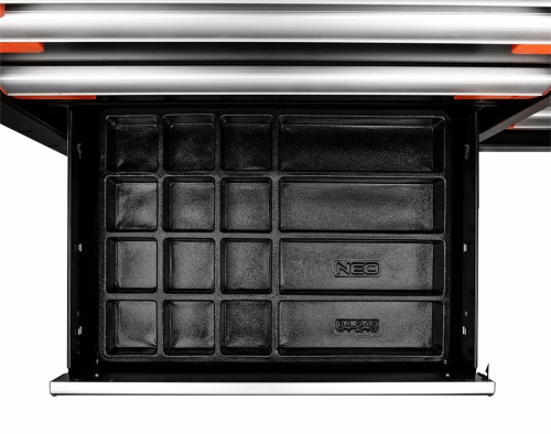 Robustný a priestranný dielenský vozík, ktorý je vybavený 12 zásuvkami v štyroch rôznych veľkostiach. Súprava pozostáva zo šiestich veľkých zásuviek (3 nízke zásuvky s rozmermi 56 x 40 x 6 cm a 3 vysoké zásuvky s rozmermi 56 x 40 x 13,9 cm) a 6 malých zásuviek (3 nízke zásuvky s rozmermi 25,25 x 40 x 6 cm a 3 vysoké zásuvky s rozmermi 25,25 x 40 x 13,9 cm). Má pevné oceľové telo a hliníkovú hornú časť s otvormi na skrutkovače. Bočná perforácia umožňuje inštaláciu háčikov a ďalšieho príslušenstva značky NEO.