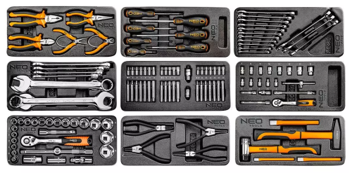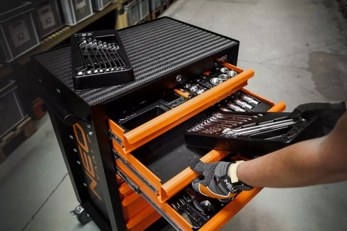 Dielenský vozík, 7 zásuviek + 129 nástrojov s rozmermi 680 x 460 x 1030 mm a nosnosťou 280 kg. Má robustné oceľové telo, centrálne zamykanie, gumové obloženie na hornej strane a výsuvy s guličkovými ložiskami. Vďaka kolieskam s veľkým priemerom 125 mm a bočnej rukoväti sa ľahko prepravuje. Obsah je zabezpečený centrálnym zámkom. Skriňa sa ponúka s vybranými vložkami s náradím. Ide o optimálnu súpravu obsahujúcu potrebné náradie na mechanické opravy.