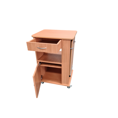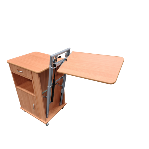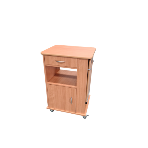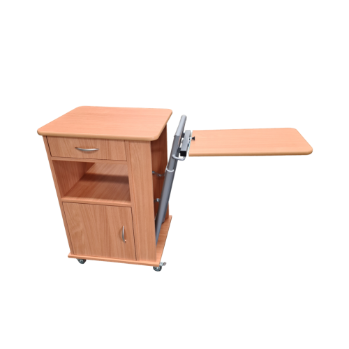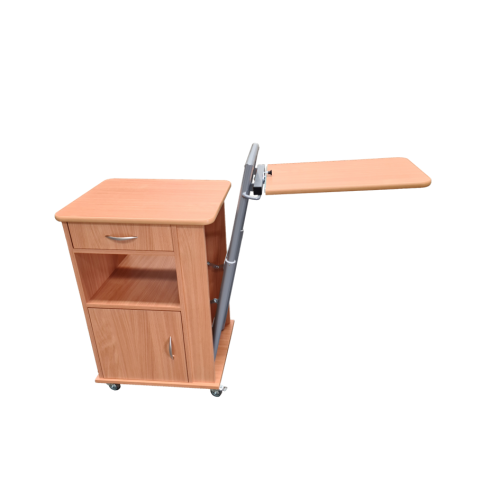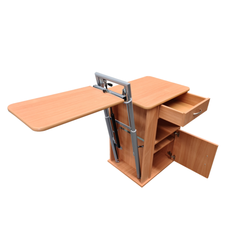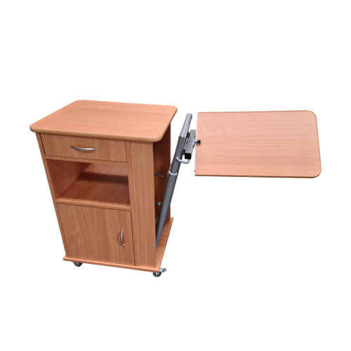 Nočný stolík s výškovo nastaviteľnou a sklopnou jedálenskou doskou, ktorá uľahčuje a spríjemňuje stolovanie alebo čítanie. Tento model v sebe spája nočný stolík a jedálenský stôl k lôžku. V štandarde sa dodáva ako obojstranný. Za príplatok je možný iný dekor dreva alebo uzamykateľná zásuvka alebo oddelenie.