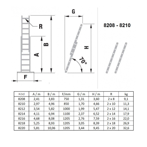Dvojdielny hliníkový rebrík vhodný na profesionálne použitie. Typy 8208 a 8210 možno rozdeliť na 2 samostatné rebríky. Rebrík je dostupný vo variantoch od 2 x 8 do 2 x 20 stupienkov. Nosnosť je 150 kg. Tovar je zvyčajne k rýchlemu dodaniu.