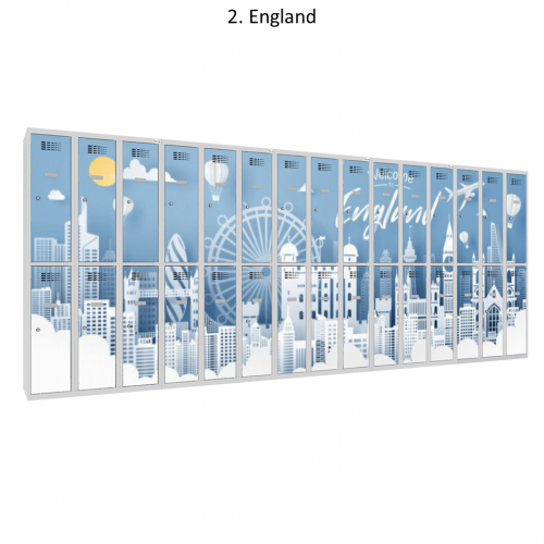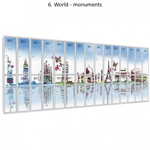 Kovový šatník s potlačou šírky 600 mm. Potlač je rezistentná voči UVA a UVB žiareniu a vyznačuje sa zvýšenou odolnosťou proti mechanickému poškodeniu, napr. poškriabaniu. Nami dodávaná špeciálna UV potlač je neporovnateľne odolnejšia ako fóliový polep a štyrikrát odolnejšia ako štandardná potlač. Farebná úprava povrchu je trvácna a vyznačuje sa veľmi živými farbami. Šatňové skrine s potlačou na dverách sú vhodné pre školy a organizácie, ktoré chcú neobyčajným spôsob zdieľať svoje posolstvo alebo len jednoducho oživiť svoje priestory, prípadne upútať jedinečným firemným vizuálom.