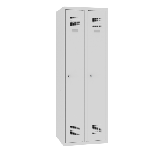2-dverový kovový šatník, šírky 600 mm. Šatňová skriňa je určená predovšetkým pre školské zariadenia. V základnej cene s jednobodovým uzamykaním na kľúč (2 kľúče ku každému zámku), na vyžiadanie v tej istej cene môže byť s otočným uzáverom na visiaci zámok (visiaci zámok nie je v cene).