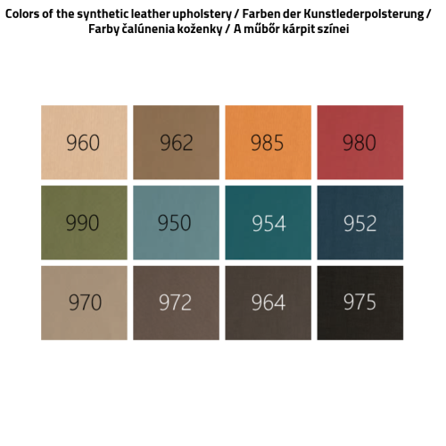 K dispozícii je 12 farieb materiálu podobného koži, ktorý je ohňovzdorný. Číselný kód odtieňu farby prosíme uvádzajte do poznámky - pri dopytoch a objednávkach.