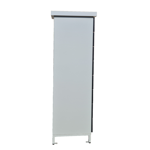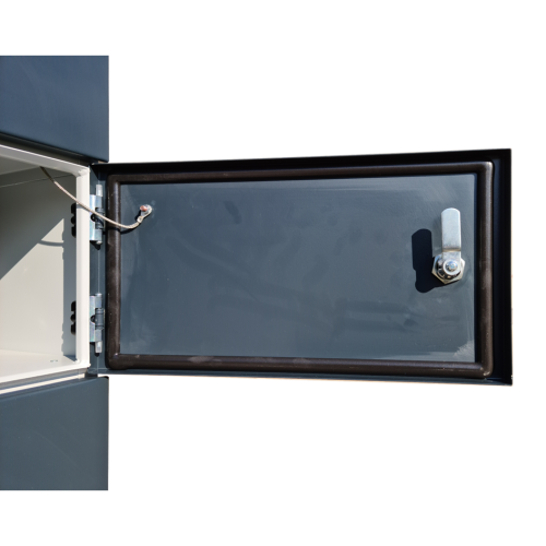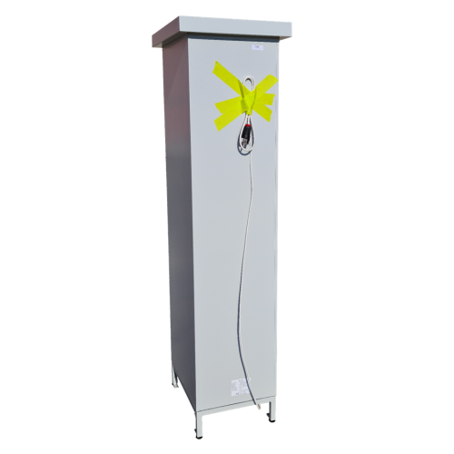 Kovová skriňa s oddeleniami vybavenými 230 V zásuvkami, vhodná na použitie v exteriéri aj interiéri. Skriňa je vyrobená z galvanizovaného oceľového plechu hrúbky 1 - 3 mm. Povrch je ošetrený práškovou farbou. Konštrukcia je zváraná a je možné ju kotviť do podkladu, spojovací materiál je súčasťou balenia, koncovky nôh majú nastaviteľnú výšku. V štandardnom vyhotovení sú dvere vybavené uzamykaním na kľúč (2 kľúče pre každé dvere), za príplatok je možné objednať aj iné typy uzamykania, napr. kódovací zámok. Dvere majú skryté pánty, čo zabezpečuje bezpečnosť a moderný vzhľad. Vo vnútri každého oddelenia je 230 V zásuvka (IP54). Skriňa je vybavená aj poistkou. Pripojenie do elektrickej siete je prostredníctvom napájacieho kábla.