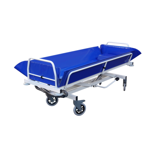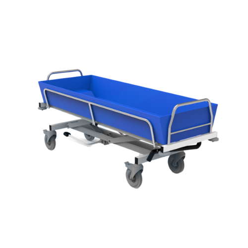 Prepravný a kúpací vozík s konštrukciou z ocele s práškovou povrchovou úpravou. Má PVC vaňu s vodotesným vankúšom a odtokom. Hydraulické nastavenie výšky pomocou nožných pák umiestnených na oboch stranách vozíka (regulovateľné 840 - 1200 mm). Možnosť nastavenia vozíka do zvolenej výšky zvyšuje komfort používania vozíka personálom. Vozík je vybavený kolieskami (priemer 200 mm) s brzdami a sklopnými zábranami. Nosnosť výrobku je 140 kg.