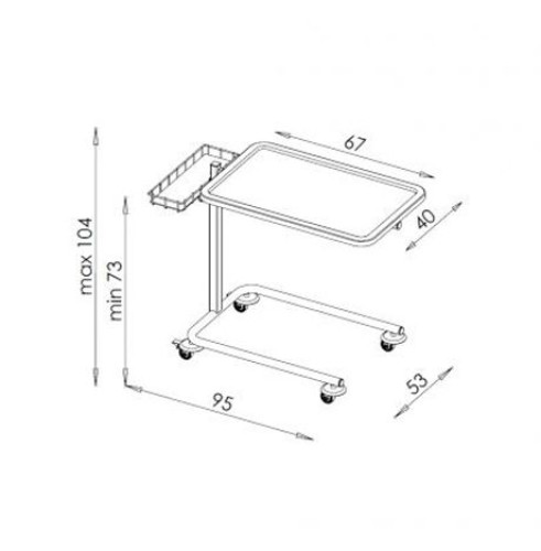Kovový jedálenský stolík k lôžku pacienta. Farba konštrukcie je šedá ošetrená antimikrobionálnou farbou. Doska stola s prelisom, ručne nastaviteľná. Dosku je možné naklápať v dvoch polohách na obe strany. Vybavenie stolíka: 1 x prídavný kôš s plastovým dnom, 1 x kôš na podvozok. Stolík má 4 otočné kolesá priemeru 50 mm vybavené plastovými nárazníkmi, z toho 2 brzdené. Celková nosnosť dosky stolíka je 10 kg.