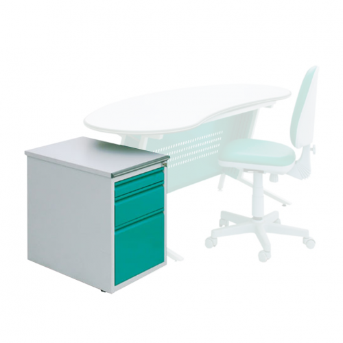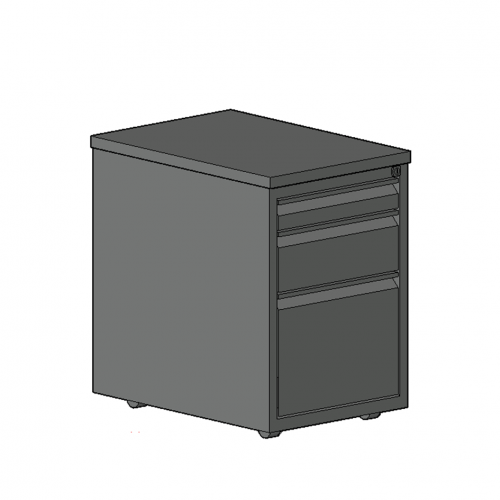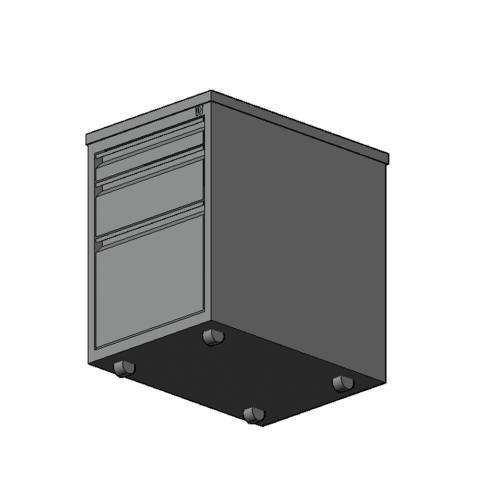 Kovový trojzásuvkový kontajner pod stôl. Zásuvky na guličkových výsuvoch s ochranou proti vytiahnutiu viacerých zásuviek naraz. Kontajner má centrálny zámok a horná časť je pokrytá melamínovou doskou. Dolná zásuvka je určená na skladovanie dokumentov formátu DIN A4.