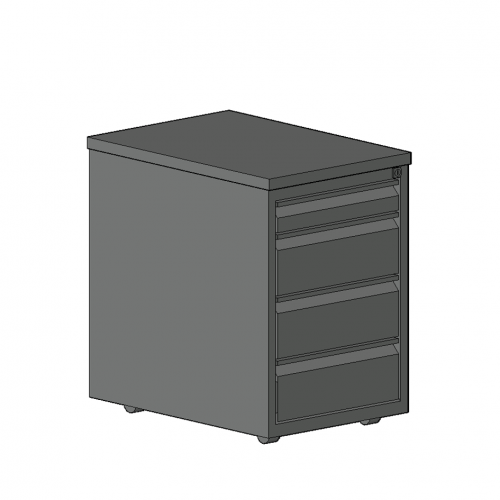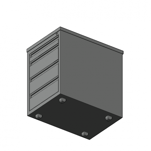 Kovový štvorzásuvkový kontajner pod stôl. Zásuvky na guličkových výsuvoch s ochranou proti vytiahnutiu viacerých zásuviek naraz. Kontajner má centrálny zámok a horná časť je pokrytá melamínovou doskou.
