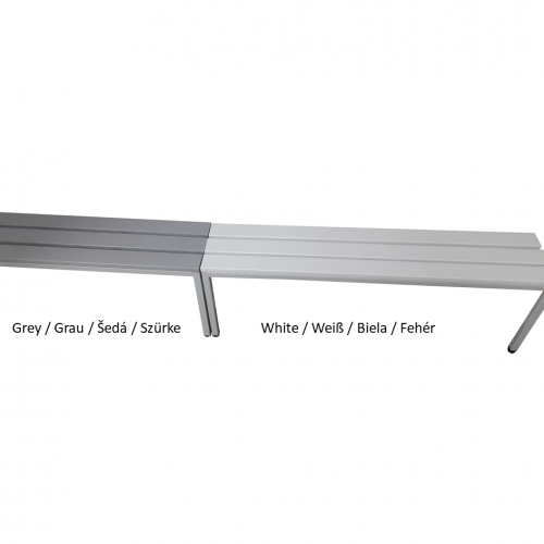 Kovová šatňová lavička šírky 1000 mm s rámom z uzavretých profilov a PVC doskami. Dosky môžu byť bielej alebo šedej farby.