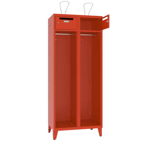 Dvojmiestna plechová šatňová skriňa pre hasičov na nožičkách. Detailný popis