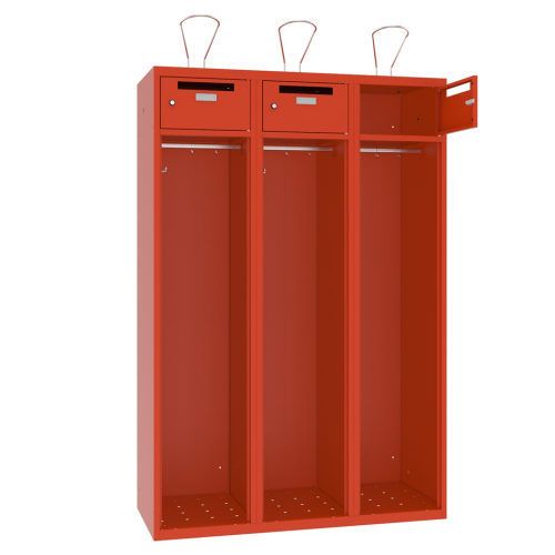 Trojmiestna plechová šatňová skriňa pre hasičov.