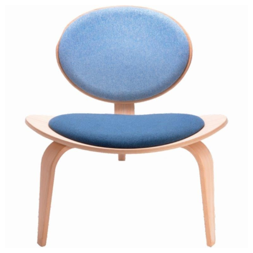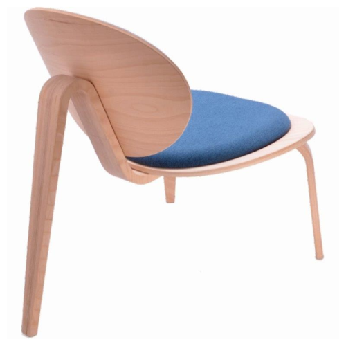 Čalúnené kreslo netradičného tvaru s nohami z ohýbanej preglejky. Farba čalúnenia a farba dreva je voliteľná, viď. obrázky produktu. Výška x šírka x hĺbka sedadla: 400 x 540 x 450 mm.
