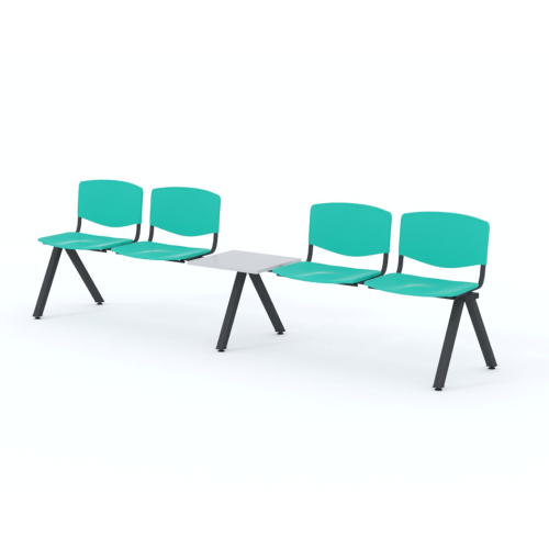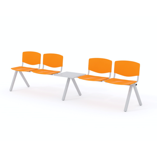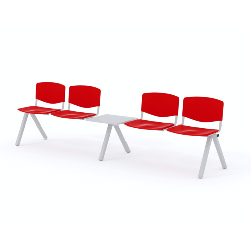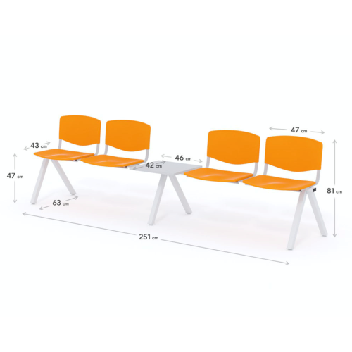 Štvormiestna lavica do čakárne so zváraným kovovým rámom, plastovými sedákmi a dreveným stolíkom vyrobeným zo šedej drevotriesky (za príplatok sú možné aj iné farby). Vďaka zvarenej konštrukcii je lavička veľmi odolná a po doručení nemusíte výrobok skladať. Navyše pre dlhšiu trvácnosť, je pod sedákom umiestnená jedna výstuha naviac. Prevedenie konštrukcie nedovoľuje lavici dotýkať sa steny, tým bráni jej poškodeniu. Lavica je vybavená nastaviteľnými koncovkami nôh - viete dať lavicu do roviny aj pri krivej podlahe. Produkt je vyrobený na Slovensku.