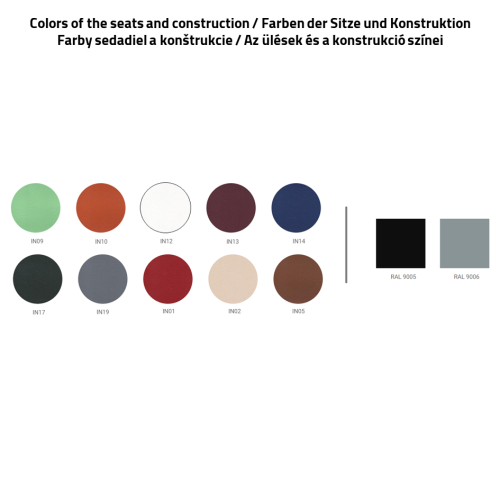 Koženkové sedáky si môžete vybrať z viacerých farieb: IN09 - bledozelená, IN10 - oranžová, IN12 - biela, IN13 - bordová, IN14 - tmavomodrá, IN17 - tmavozelená, IN19 - sivá, IN01 - červená, IN02 - béžová, IN05 - hnedá. Požadovanú farbu uvádzajte do poznámky - pri dopytoch a objednávkach.