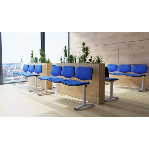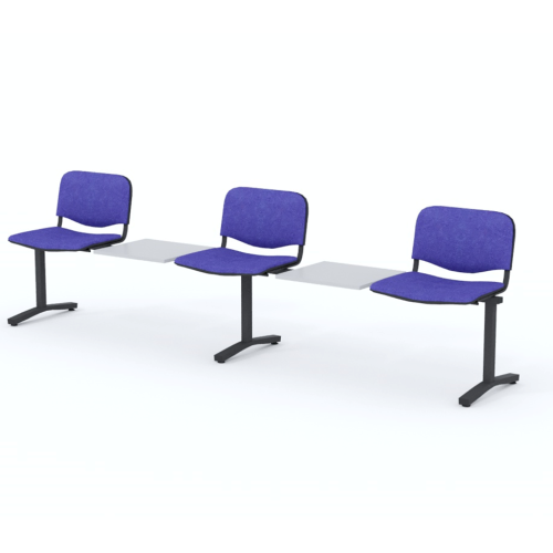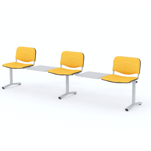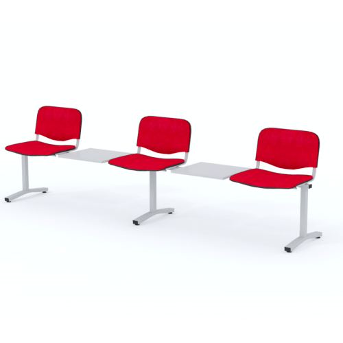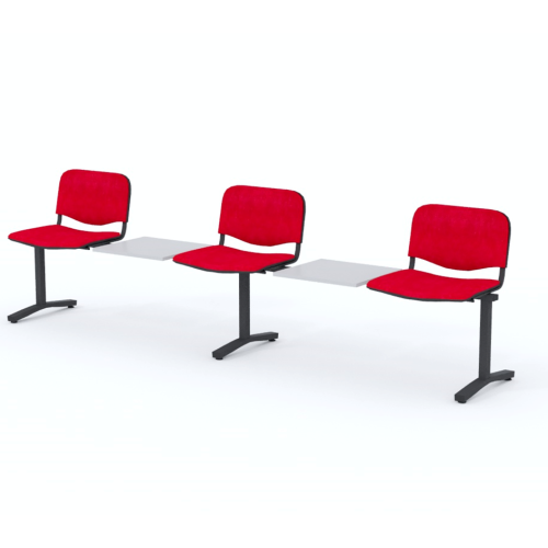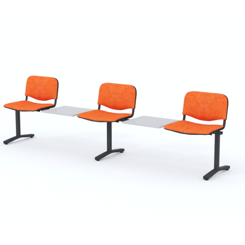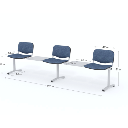 Trojmiestna lavica do čakárne so zváraným kovovým rámom, čalúnenými sedákmi a drevenými stolíkmi vyrobeným zo šedej drevotriesky (za príplatok sú možné aj iné farby). Vďaka zvarenej konštrukcii je lavička veľmi odolná a po doručení nemusíte výrobok skladať. Navyše pre dlhšiu trvácnosť, je pod sedákom umiestnená jedna výstuha naviac. Prevedenie konštrukcie nedovoľuje lavici dotýkať sa steny, tým bráni jej poškodeniu. Lavica je vybavená nastaviteľnými koncovkami nôh - viete dať lavicu do roviny aj pri krivej podlahe. Produkt je vyrobený na Slovensku.