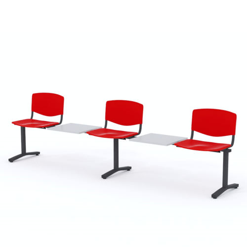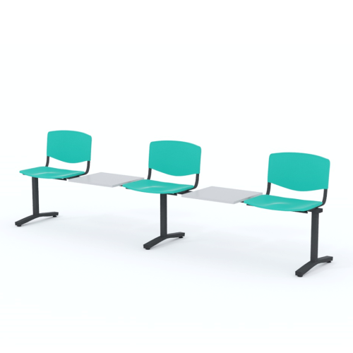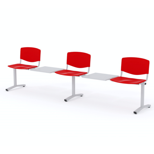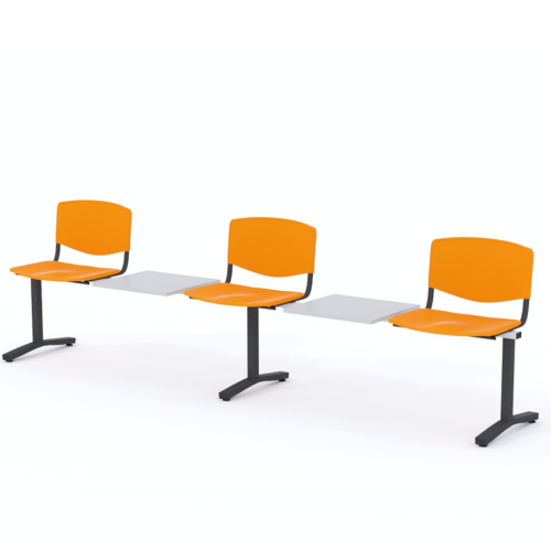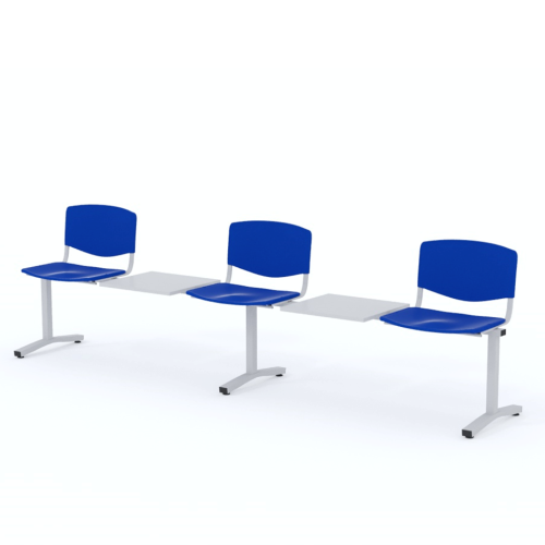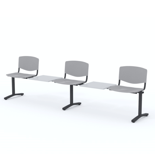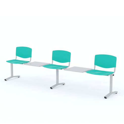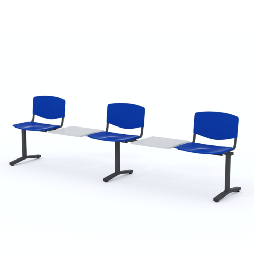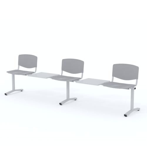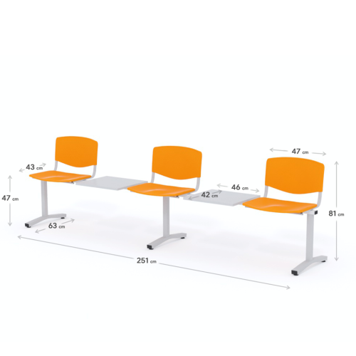 Trojmiestna lavica do čakárne so zváraným kovovým rámom, plastovými sedákmi a drevenými stolíkmi vyrobenými zo šedej drevotriesky (za príplatok sú možné aj iné farby). Vďaka zvarenej konštrukcii je lavička veľmi odolná a po doručení nemusíte výrobok skladať. Navyše pre dlhšiu trvácnosť, je pod sedákom umiestnená jedna výstuha naviac. Prevedenie konštrukcie nedovoľuje lavici dotýkať sa steny, tým bráni jej poškodeniu. Lavica je vybavená nastaviteľnými koncovkami nôh - viete dať lavicu do roviny aj pri krivej podlahe. Produkt je vyrobený na Slovensku.