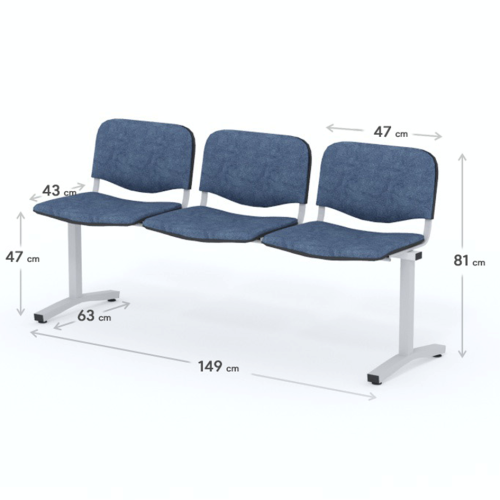 Trojmiestna lavica do čakárne so zváraným kovovým rámom a čalúnenými sedákmi. Vďaka zvarenej konštrukcii je lavička veľmi odolná a po doručení nemusíte výrobok skladať. Navyše pre dlhšiu trvácnosť, je pod sedákom umiestnená jedna výstuha naviac. Prevedenie konštrukcie nedovoľuje lavici dotýkať sa steny, tým bráni jej poškodeniu. Lavica je vybavená nastaviteľnými koncovkami nôh - viete dať lavicu do roviny aj pri krivej podlahe. Produkt je vyrobený na Slovensku.