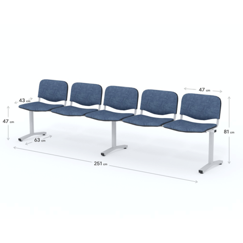 Päťmiestna lavica do čakárne so zváraným kovovým rámom a čalúnenými sedákmi. Vďaka zvarenej konštrukcii je lavička veľmi odolná a po doručení nemusíte výrobok skladať. Navyše pre dlhšiu trvácnosť, je pod sedákom umiestnená jedna výstuha naviac. Prevedenie konštrukcie nedovoľuje lavici dotýkať sa steny, tým bráni jej poškodeniu. Lavica je vybavená nastaviteľnými koncovkami nôh - viete dať lavicu do roviny aj pri krivej podlahe. Produkt je vyrobený na Slovensku.
