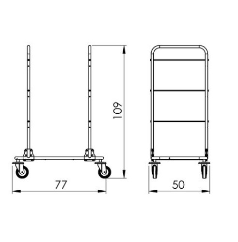 Kovový vozík s chrómovou konštrukciou. Vozík je bez výbavy, za príplatok je možné ho vybaviť rôznym príslušenstvom. Kolesá sú otočné s plastovými nárazníkmi, priemer 100 mm. Celková nosnosť výrobku je 100 kg.