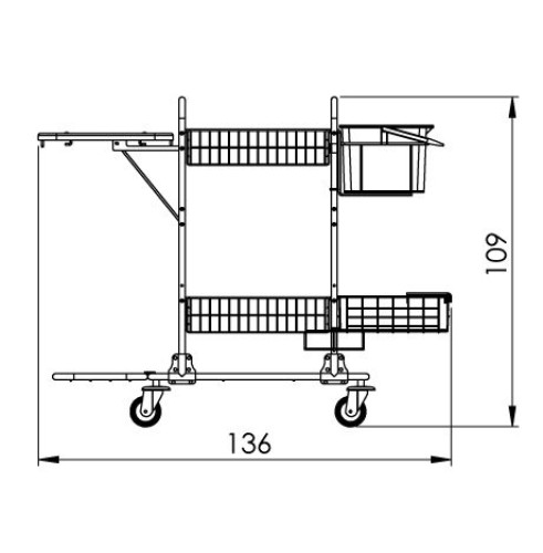 Kovový vozík s chrómovou konštrukciou. Vozík je vybavený: 2 x kôš - nosnosť 20 kg 2 x držiak 80 l vaku, 2 x plastové veko 80 l (dostupné: červená, modrá, zelená, žltá), 1 x držiak vedra, 2 x vedro 9 l (červená, modrá) - nosnosť 6 kg, 1 x kôš s plastovým dnom s držiakom na saponáty - nosnosť 6 kg, 1 x držiak mopu, 1 x úchytka násady mopu. Kolesá sú otočné s plastovými nárazníkmi, priemer 100 mm. Celková nosnosť výrobku je 100 kg.