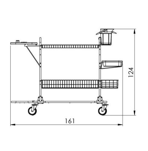 Kovový vozík s chrómovou konštrukciou. Vozík je vybavený: 1 x sklopný držiak 120 l vaku, 1 x držiak vedra, 2 x vedro 6 l (červená, modrá), 1 x plastové veko 120 l (dostupné: červená, modrá, zelená, žltá), 1 x drôtený kôš, 1 x veľký kôš s plastovým dnom - nosnosť 20 kg, 1 x malý kôš s plastovým dnom - nosnosť 6 kg, 1 x plastová vaňa s držiakom, 1 x plastové dno podvozku. Kolesá sú otočné s plastovými nárazníkmi, priemer 100 mm. Celková nosnosť výrobku je 100 kg.