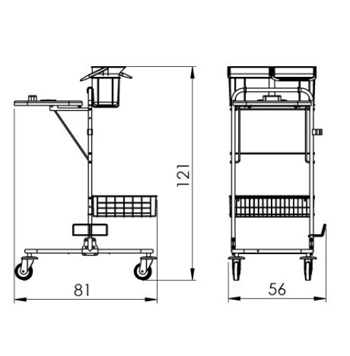 Kovový vozík s chrómovou konštrukciou. Vozík je vybavený: 1 x sklopný držiak 120 l vaku, 2 x vedro 6 l (červená, modrá), 1 x plastové veko (dostupné: červená, modrá, zelená, žltá), 1 x kôš - nosnosť 6 kg. Kolesá sú otočné s plastovými nárazníkmi, priemer 100 mm. Celková nosnosť výrobku je 50 kg.