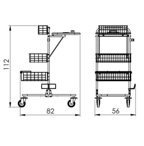 Kovový vozík s chrómovou konštrukciou. Vozík je vybavený: 1 x držiak 120 l vaku, 1 x plastové veko 120 l (dostupné: červená, modrá, zelená, žltá), 2 x drôtený kôš - nosnosť 6 kg, 1 x kôš s plastovým dnom a držiakom saponátov - nosnosť 6 kg, 1 x držiak mopu, 1 x držiak násady mopu. Kolesá sú otočné s plastovými nárazníkmi, priemer 100 mm. Celková nosnosť výrobku je 100 kg.