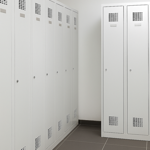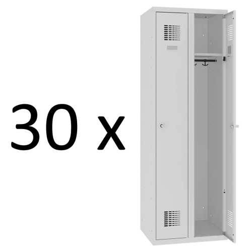 30 kusov štandardných kovových šatníkov šírky 600 mm za akciovú cenu. Skriňa je uzamykateľná a dodáva sa s 2 kľúčmi pre každé dvere. Vnútorné vybavenie zahŕňa policu v hornej časti oddelenia, tyč s dvoma háčikmi na zavesenie oblečenia, samolepiace zrkadlo, menovku a háčik na dverách.