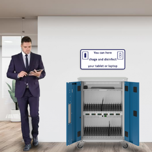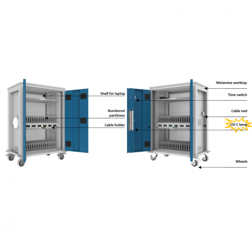 Vozík na úschovu, nabíjanie, dezinfekciu a prepravu elektronických zariadení. Kapacita: 1 počítač a 32 tabletov - smartfónov. Oproti našim štandardným produktom je vybavený zdrojom UV-C žiarenia (vymeniteľný Osram Puritec HNS 8W), ktorý slúži na zničenie všetkým choroboplodných zárodkov bez použitia chemikálií. Výhodou používania tohto produktu je šetrná dezinfekcia všetkých uskladnených zariadení, pretože na obrazovkách a dotykových plochách sa sústreďuje najviac vírusov a baktérií spomedzi všetkých vecí, s ktorými prichádzame denne do kontaktu.