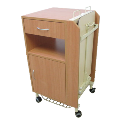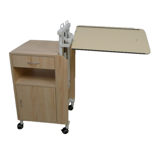 Obojstranne prístupný nočný stolík s výklopnou jedálenskou doskou. Prevedenie s bukovým dekorom. Jedálenská doska je vyrobená z HPL. Nočný stolík je vybavený 50 mm kolieskami, 2 s brzdou. Vo vnútri skrine je priestor na skladovanie 1 fľaše. Za príplatok je možné objednať kôš na obuv, ktorý sa uchytáva na spodok skrine alebo iný typ koliesok.