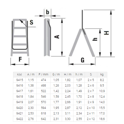 5 až 12-stupňové obojstranné hliníkové schodíky so sklopným držadlom, madlom. Rebrík je vhodný na profesionálne použitie. Parametre jednotlivých variantov, viď. tabuľka v obrázkoch produktu.