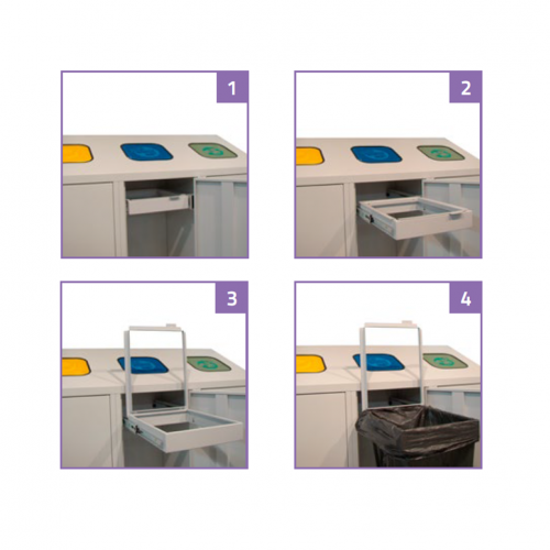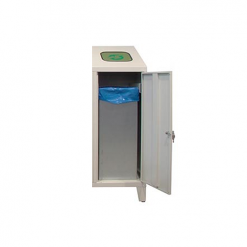 Kovový odpadkový kôš, ktorý je možné umiestniť v interiéroch. S uzamykateľnou konštrukciou a samozatváracím vekom v hornej časti nádoby. V základnej výbave s pozinkovaným košom na odpadky.