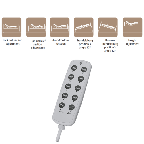 Jeho ergonomický tvar poskytuje pohodlné používanie jednou rukou a rýchly prístup ku všetkým funkciám postele. Je tiež možné zablokovať jednotlivé funkcie.