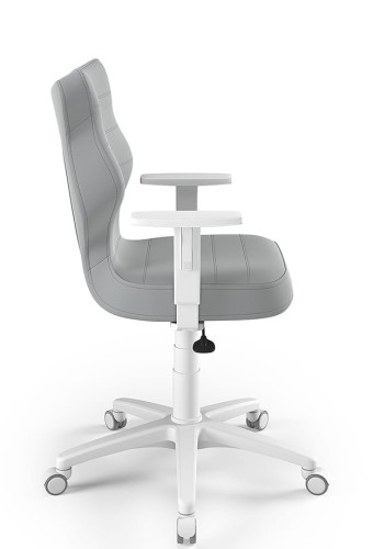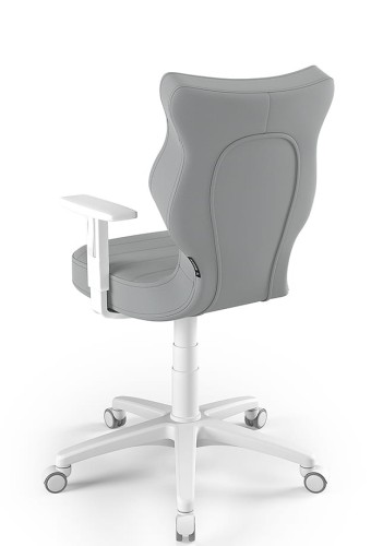 Čalúnená stolička Petit pre telesnú výšku od 146 do 176 cm. Stolička je vybavená bielym rámom a opierkami rúk s nastaviteľnou výškou. Jedná sa o vysoko kvalitný výrobok, ktorý bol navrhnutý a kompletne vyrobený v EÚ. Čalúnenie má šedú farbu. Stolička je ergonomicky nadizajnovaná a podporuje zdravé sedenie. Operadlo je presne prispôsobené tvaru chrbtice. Vďaka tomu je chrbát menej unavený. Stolička núti zaujať zdravú polohu pri sedení, ktorá zároveň poskytuje maximálne pohodlie. Táto stolička je vynikajúcou voľbou pre spotrebiteľov, ktorí ocenia pohodlie a komfort pri dlhšom sedení, či už pri plnení povinností za písacím stolom alebo pri zábave na počítači. Stolička je vhodná ku stolom výšky 70-82 cm. Produkt je certifikovaný a jeho nosnosť je 110 kg.