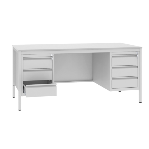 Kovový kancelársky stôl s melamínovou doskou stola. Vybavený troma zásuvkami na oboch stranách. Dodávané v demontovanom stave, možnosť montáže na vyžiadanie.