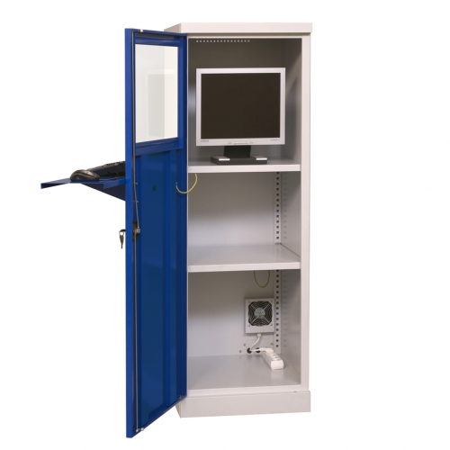 Kovová ochranná skriňa na priemyselný počítač, hlboké prevedenie. Predný sklenený panel určený na montáž klasického monitora. Výbava: pevná polica na klávesnicu a myš, ventilátor, napájanie so 4 zásuvkami.