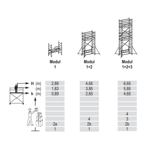 Hliníkové lešenie na kolieskach. Max. pracovná výška je 4,65 m. Konštrukcia je stavebnicová, montáž je bez spojovacieho materiálu, len prostredníctvom rýchloupínacích komponentov. Nosnosť lešenia je 200 kg/m2.