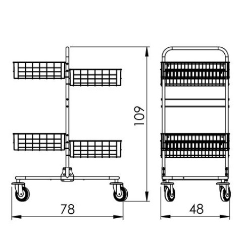 Kovový stojan s košmi s chrómovou povrchovou úpravou. Závesné koše: 4 x 00023, nosnosť 6 kg. Kolesá sú otočné s plastovými nárazníkmi, priemer 100 mm, z toho 2 s brzdou. Celková nosnosť stojana je 30 kg.