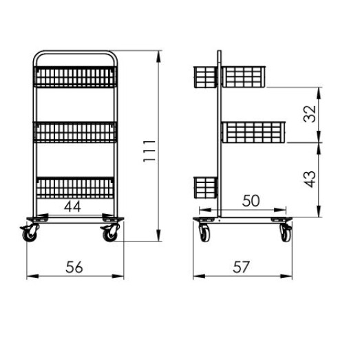 Pojazdný stojan s košíkmi z AISI304 nehrdzavejúcej ocele. Stojan je vybavený: