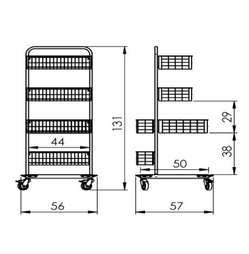 Stojan na kolieskach s drôtenými košíkmi. Detailný popis