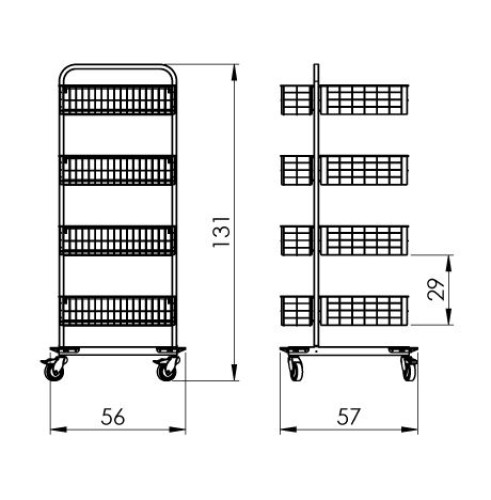 Stojan na kolieskach s drôtenými košíkmi. Detailný popis