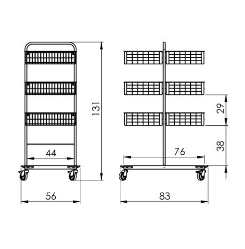 Stojan na kolieskach s drôtenými košíkmi. Detailný popis