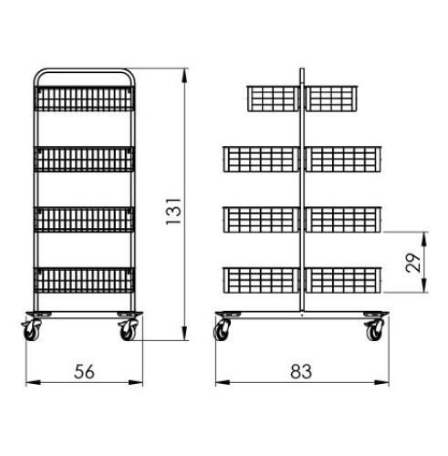 Pojazdný stojan s košíkmi z AISI304 nehrdzavejúcej ocele. Stojan je vybavený: