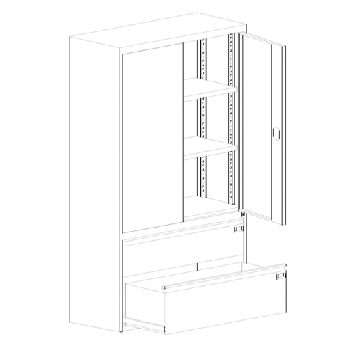 Policová skriňa so zásuvkami šírky 1000 mm. Kombinovaná skriňa: uzamykateľné horné oddelenie s krídlovými dverami a nastaviteľnými policami po 25 mm po celej výške oddelenia. V dolnej časti 2 zásuvky pre formát A4 horizontálne.
