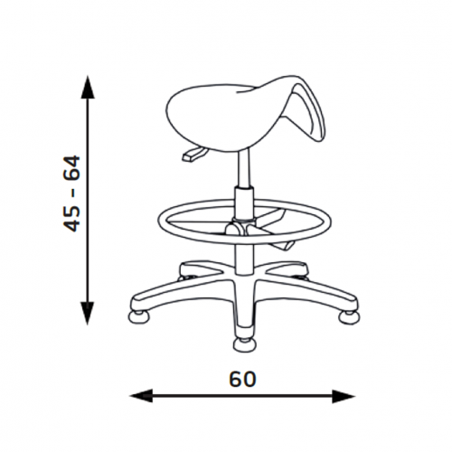 Pracovná sedlová stolička z ergonomicky tvarovaného mäkčeného polyuretánu. Stolička sa dodáva v čiernej farbe. Povrch je možné jednoducho čistiť. Výbava zahŕňa čierny nylonový kríž s kolieskami priemeru 50 mm. Nosnosť stoličky je 100 kg. V základnej výbave s piestom s nastaviteľnou výškou od 450 - 640 mm a aretačným kruhom. Za príplatok možné objednať aj s extra vysokým piestom (550 - 810 mm).