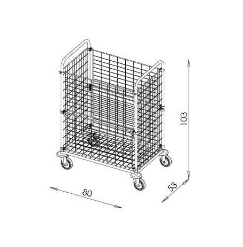 Kovová klietka na kolieskach s chrómovou povrchovou úpravou. Funkcie: 1 x sklopná horná bočnica. Vozík je vybavený 4 x otočným kolesom priemeru 100 mm s plastovými nárazníkmi. Celková nosnosť výrobku je 150 kg. Vozík je možné vybaviť obalmi a vakmi.